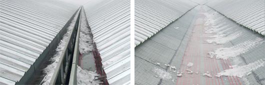 冬日里,天溝積雪是困擾著人們的難題。當(dāng)天溝積雪結(jié)冰后,致使天溝的雪水倒灌,車(chē)間廠房漏雨,屋頂?shù)淖灾卦黾?,尤其是現(xiàn)代輕鋼結(jié)構(gòu)的工業(yè)廠房,會(huì)導(dǎo)致屋頂變形,落水管堵塞,甚至?xí)霈F(xiàn)房屋倒塌現(xiàn)象。