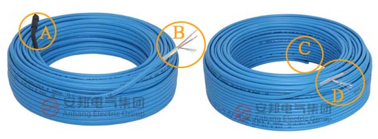 3、雙導(dǎo)發(fā)熱電纜一端為尾端(見圖中A部分),另一端為冷線(見圖中B部分);單導(dǎo)發(fā)熱電纜兩端均為冷線(見圖中C和D部分)。