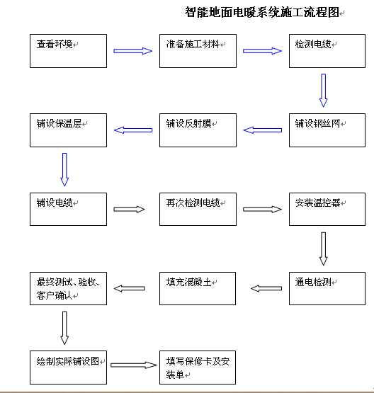 安裝的過程中需要鋪設電地暖保溫板、鋪設的時候,一定要保證地面平整和干凈,為下一道工序做好基礎。再鋪設電地暖反射膜,鋪設一定要平整,重疊處再用鋁箔膠密封,保證反射膜反熱效果。鋪設電地暖鋼絲網(wǎng),每一個房間反射膜鋪好后,就開始鋪設鋼絲網(wǎng),鋪好后用扎條固定牢固。然后進行發(fā)熱電纜的鋪設,鋪設前對發(fā)熱電纜進行檢測,記載檢測結(jié)果便于后續(xù)使用。鋪好發(fā)熱電纜后,再固定好地溫探頭,用歐姆搖表測量鋪好的電地暖電阻率。接下來就是混泥土的回填,最后安裝上溫控器。